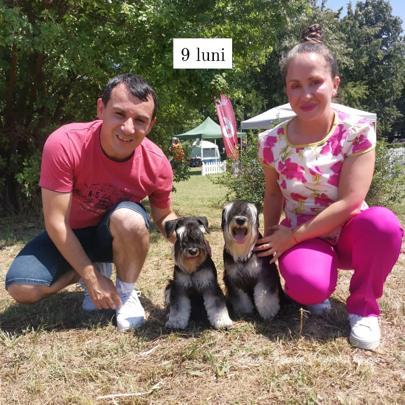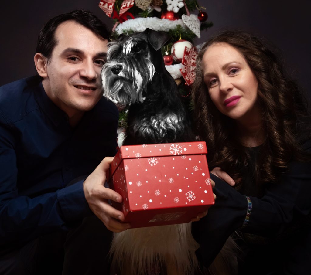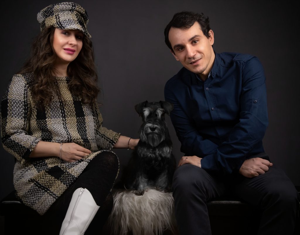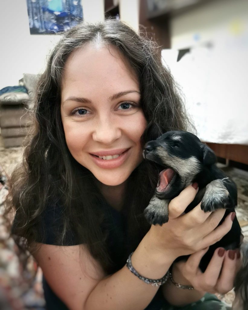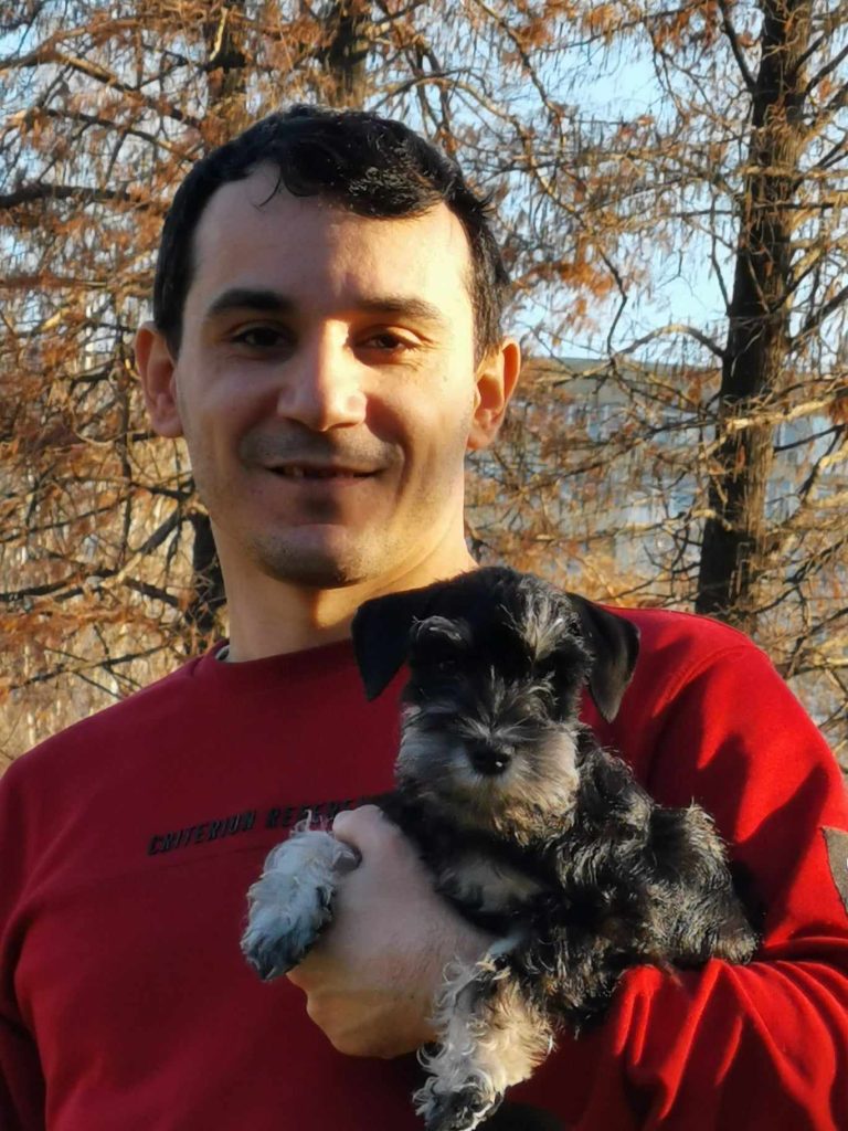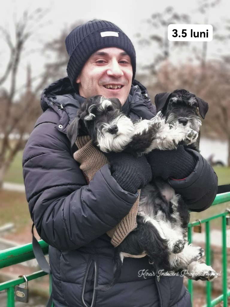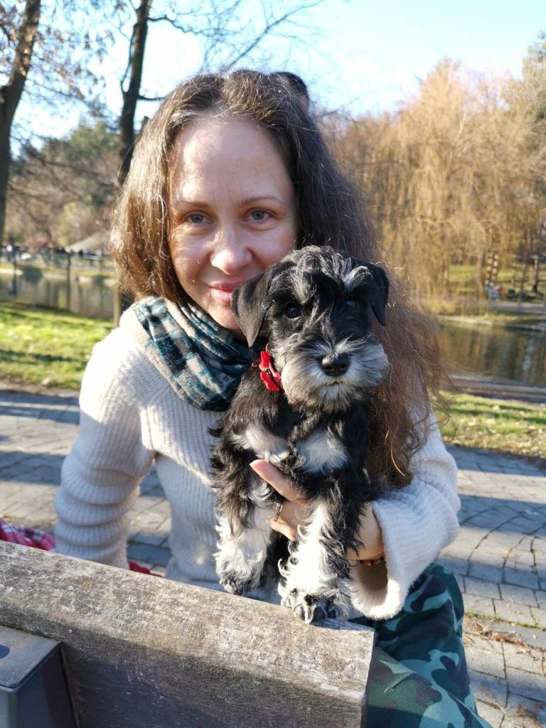 Daniel Ivopol, soțul și partenerul meu, este un om pragmatic, analitic, foarte îndrăgostit de tot ce înseamnă construcții și calculatoare, de aici și alegerea meseriei de inginer. A trăit în copilăria mică în Sinaia, unde alături de bunici a descoperit dragostea pentru câinii ciobănești mioritici și carpatini, care pe parcursul anilor i-au devenit cei mai buni prieteni, așa că atunci când m-a cunoscut pe mine și l-a adoptat pe Puff, a fost totul ca un vis împlinit. Anul 2019 a fost un an care ne-a marcat viața iremediabil și foarte trist prin moartea mamei mele și îmbolnăvirea lui Puff. El s-a îmbolnăvit în august 2019 într-un mod subit, deși în urmă cu doar câteva luni părea să fie bine, noi făcându-i analize odată la cel puțin șase luni. I-am făcut ecografii, radiografii, teste la inimă și la toate organele în urma unei tuse, căreia nu i-a fost depistată niciodată cauza. Inițial i-a fost aplicat de către medicii specialiști un tratament pentru inimă care s-a dovedit a fi greșit. Când i-am schimbat tratamentul tot la sfatul altui medic veterinar cardiolog, tusea lui s-a oprit de parcă nu ar fi existat vreodată. Apoi i-am depistat insuficienta cronică renală din cauza căreia și-a pierdut toate simțurile de la văz, auz până la miros. Această boală a culminat cu paralizia tuturor mușchilor, inclusiv paralizia mușchilor oculari. Nu ne mai dădeam seama dacă doarme sau e treaz, nu-și mai putea face nici nevoile primare. Mereu îl auzeam vaitandu-se. Doar el știa ce dureri îl mistuie. Cu toate eforturile noastre supraomenești, această boală nenorocita i-a luat dorința de a trăi, transformadu-l într-o legumă, într-un cățel anxios și ursuz. După moartea mamei pe 12 ianuarie 2020, Puff ne-a părăsit și odată cu el o parte din sufletul meu s-a dus. Nu există cuvinte să pot exprima durerea și tristețea pe care am avut-o la moartea lui și oricând îmi amintesc de el. Deși inițial am spus că nu ne vom mai lua un alt câine, a durat două săptămâni până am realizat că nu există viață fără câine, după ce ai trăit cu un câine alături. Așa că am decis să ne luăm un alt câine, dar altă rasă și alt gen, pentru a nu face comparație cu el. Nu ar fi fost corect. Așa mi-am amintit că în liceu văzusem o mogâldeată de cățel, negru cu argintiu, un pui care stătea la o tânără în brațe. Atunci m-am îndrăgostit a doua oară de o altă rasă de câine. Când am întrebat-o pe acea tânără ce rasă este mi-a spus schnauzer pitic. Amintindu-mi, am început căutările, doar că în urma celor întâmplate cu Puff, am avut trei criterii de selecție de la care nu am vrut să ne abatem: să aibă pedigree, să aibă analize genetice părinții și să ne asigurăm că sunt crescuți în casă. La primele două ne-am putut asigura, la a treia NU! Pe scurt după multe căutări, condiționați și de pandemie, a apărut Kira în viața noastră, după ce am așteptat-o șapte luni de zile să o strângem în brațe. Anul trecut am importat de la una dintre cele mai vechi canise din lume de schnauzer-pitic negru-argintiu, cea de-a doua noastră femelă, după ce am așteptat-o aproape un an: Sky. Sky îmi amintește foarte mult de Puff, prin blândețea și modul ei de a iubi. Sky provine din linii fantastice, foarte rare în Europa, însuși tatăl ei fiind campion european Budapesta 2021.